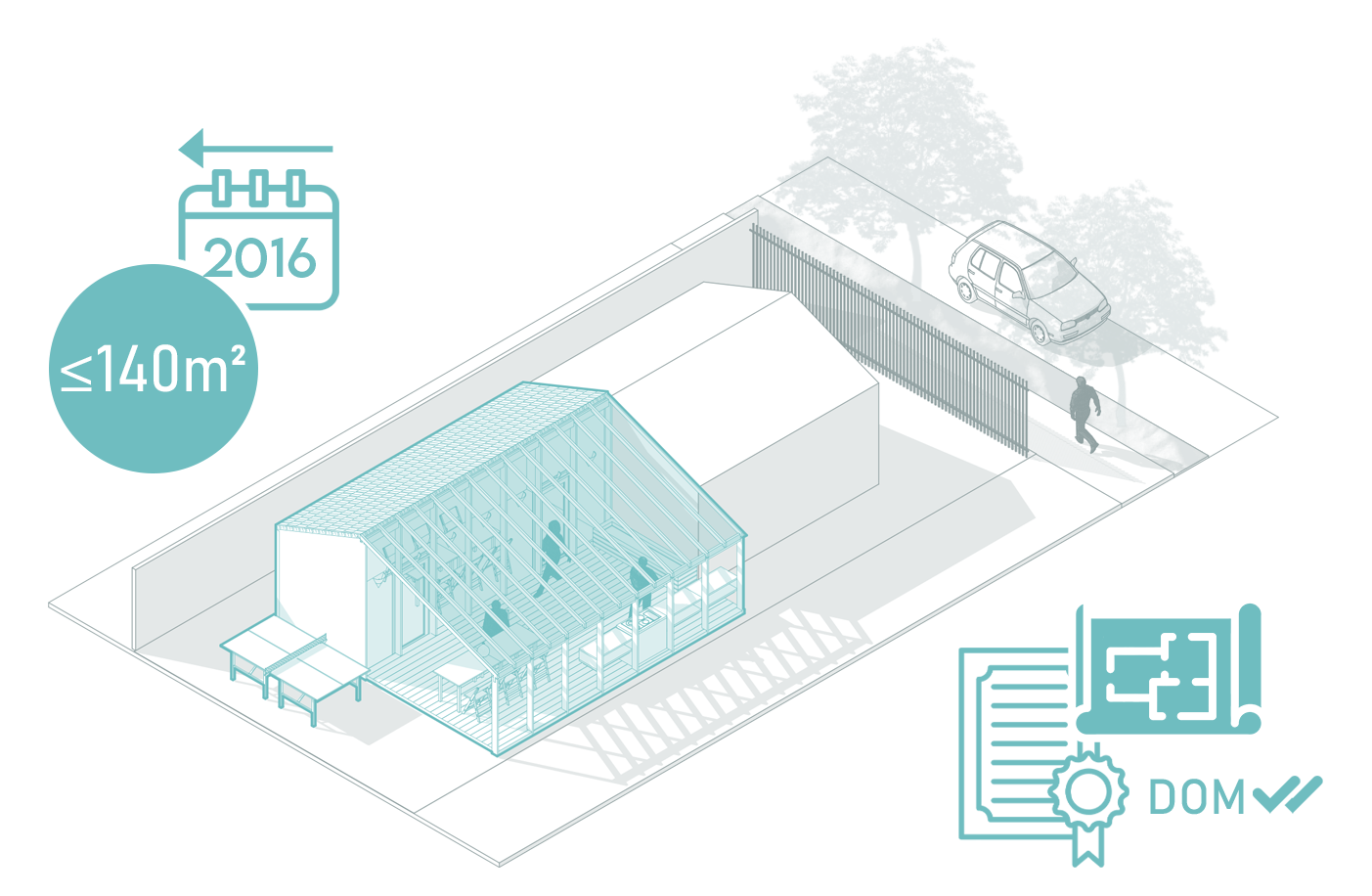 Se regulariza construcciones que se evidencie su existencia antes del Febrero del año 2016 (fecha publicada la ley), avalúo no superior a las 2000UF en la misma fecha y que conste hasta los 140m². Incluye ingreso del proyecto a la Dirección de Obras correspondiente a la municipalidad de la comuna respectiva.